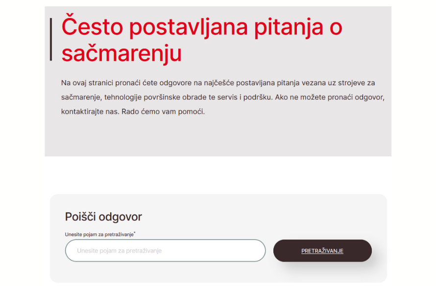 Zato smo na našoj web stranici uveli novi odjeljak Često postavljana pitanja (FAQ). Ovaj novi dio predstavlja važnu nadogradnju korisničkog iskustva i pruža još bolju podršku u svim fazama - od početnog interesa do rada i servisiranja strojeva za sačmarenje.