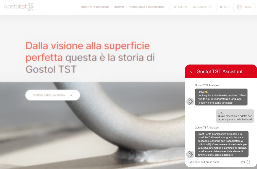 Che tu stia cercando informazioni di base sulla granigliatura, specifiche tecniche o una soluzione per il tuo caso specifico, l’assistente AI è sempre a tua disposizione.