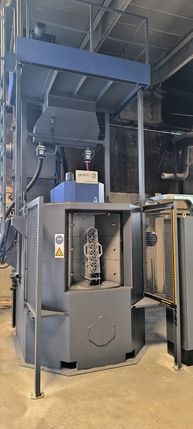 I pezzi vengono fissati su un supporto speciale sulla tavola realizzato con materiali resistenti all’usura, che garantiscono una lunga durata e un funzionamento affidabile. Le due posizioni consentono di trattare i pezzi con diversi angoli e orientamenti del getto, ottenendo una finitura superficiale precisa e uniforme.