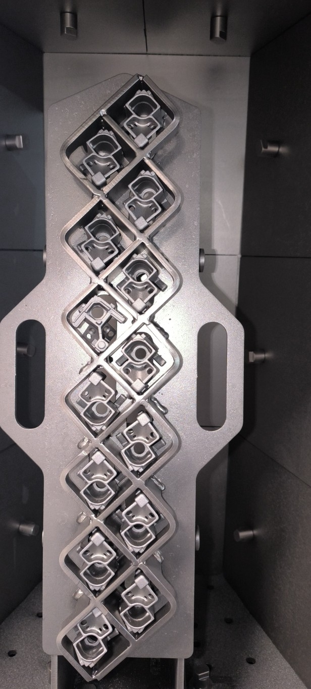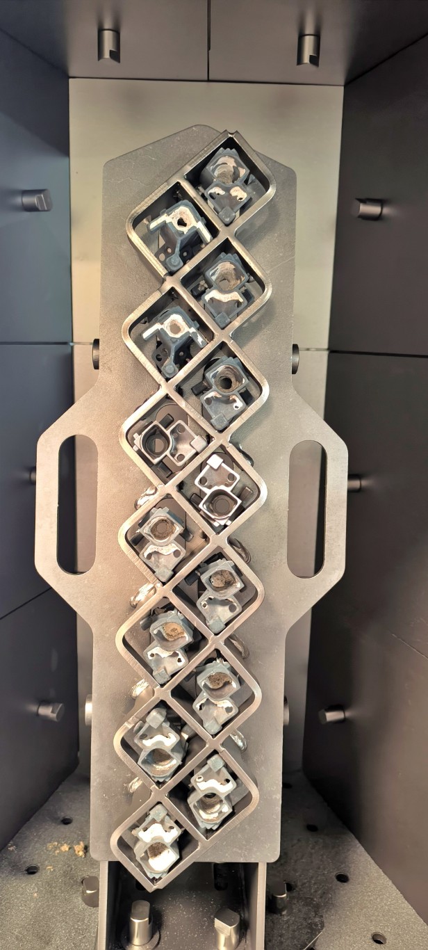 Obdelovance se pritrdi na poseben nosilec na mizi, izdelan iz materialov, odpornih proti obrabi, kar zagotavlja dolgo življenjsko dobo in zanesljivo delovanje. Dve različni lokaciji peskanja omogočata, da se lahko na eni od pozicij peska z drugačnim vpadnim kotom in pozicijo curka.