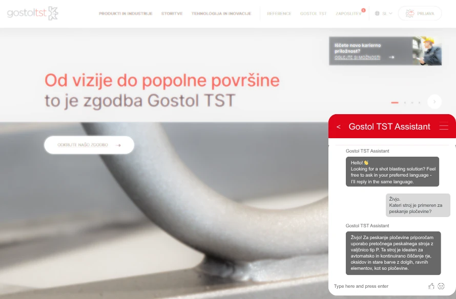 Gostol TST je mednarodno prepoznavno podjetje na področju strojev za površinsko obdelavo z več kot 75 letno tradicijo. V našem podjetju zaposlujemo predvsem strokovne kadre za področje proizvodnje, inženirje, projektante in ekonomiste, ki jih zanima dinamično delo in delovno okolje, ki nudi polno izzivov. Postani del naše ekipe in skupaj z nami oblikuj prihodnost.